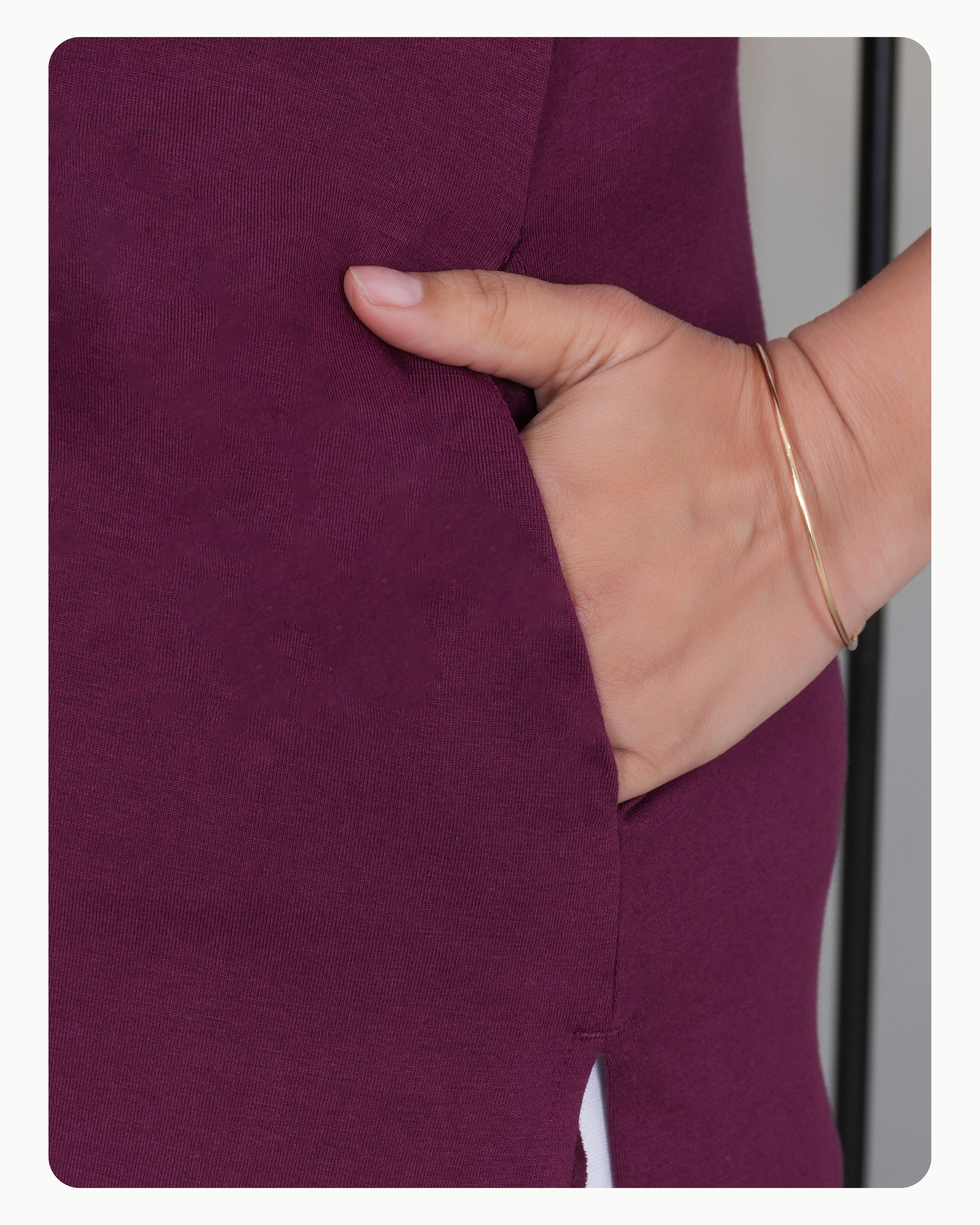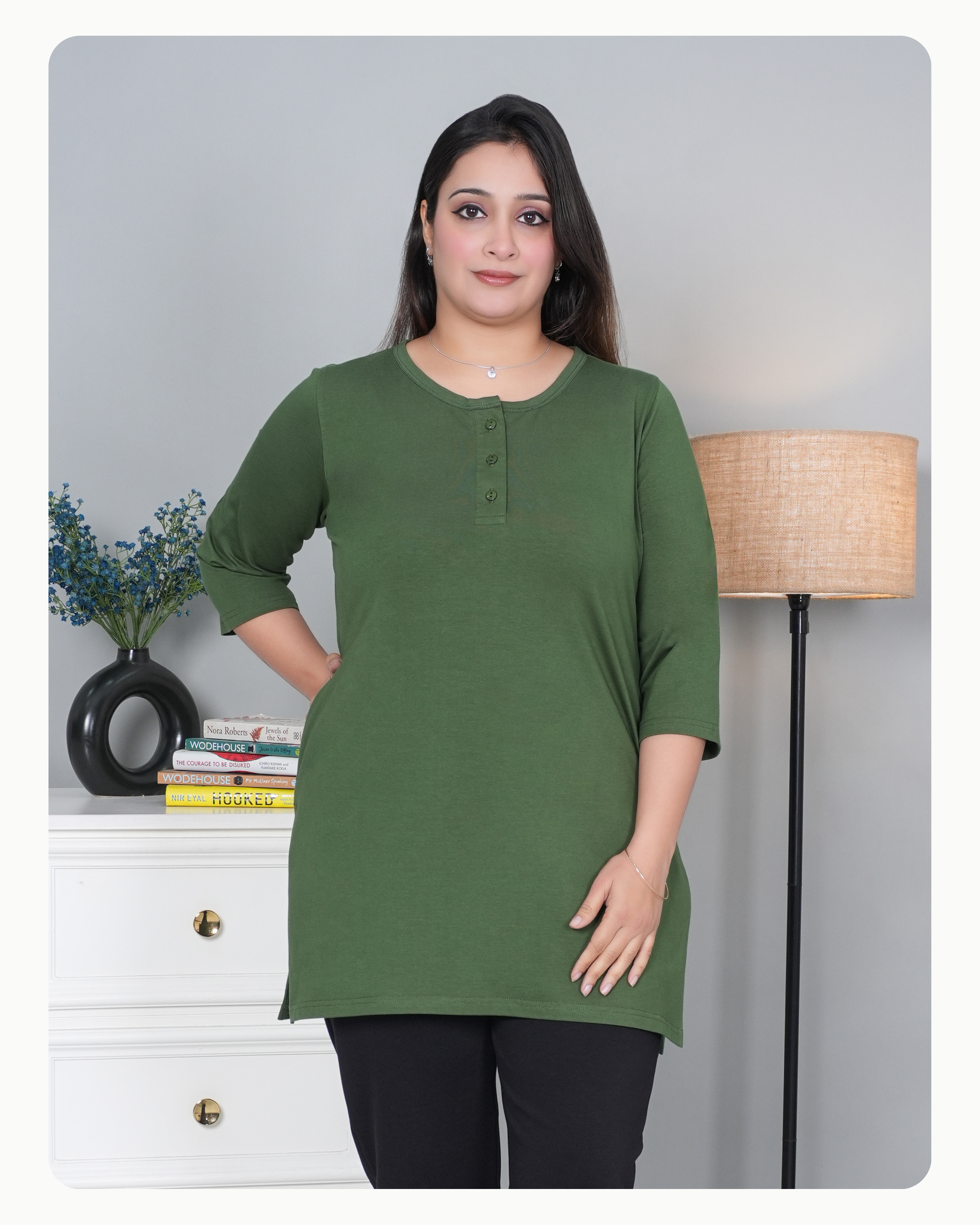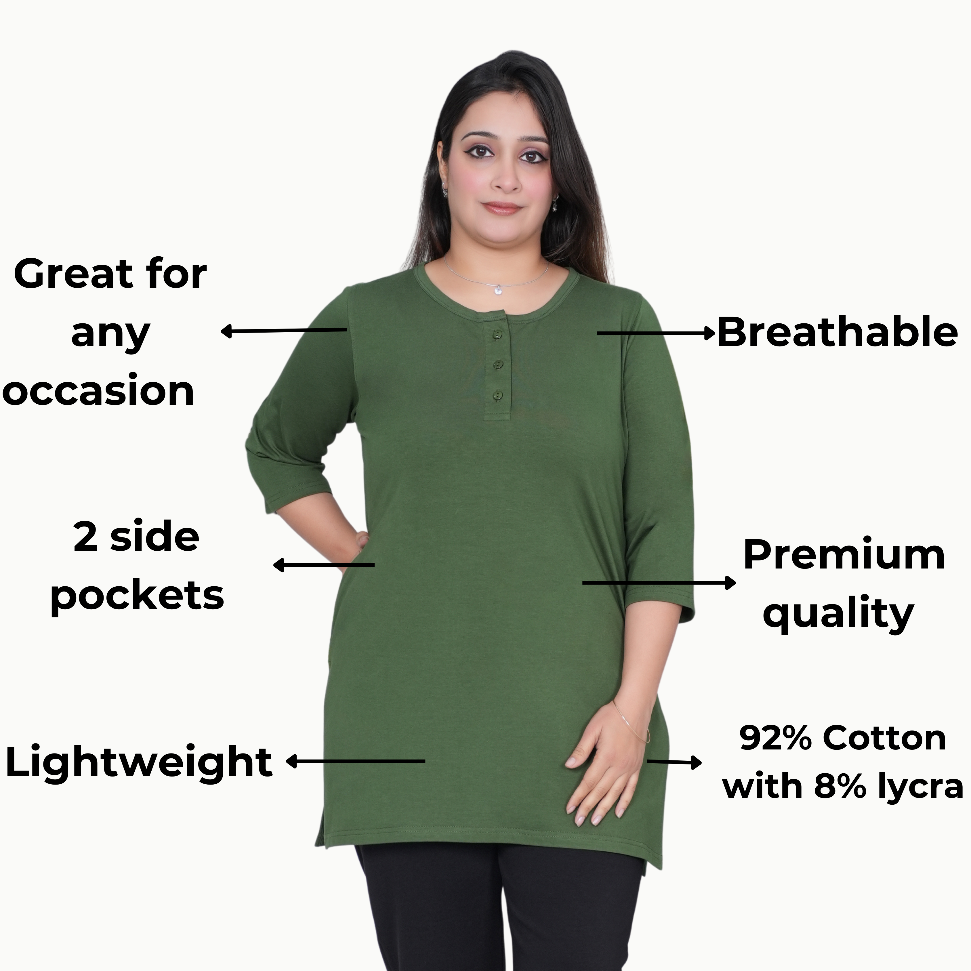 Olive long round neck henley cotton lycra t-shirt with pockets for women.