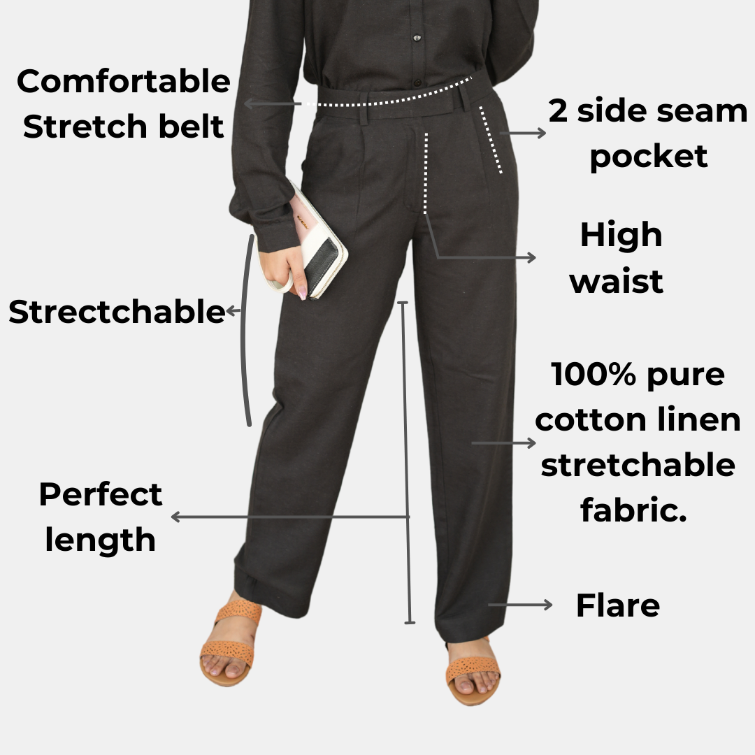 Black linen flare pants by Mlada - Where style meets comforts! High-quality, trendy, and available in all sizes with free delivery and no cost COD. Elevate your wardrobe with these timeless, fancy women's linen flare. Crafted in-house with ethical practices, these flare pants embody our commitment to quality, comfort, and enduring style. Join us in redefining fashion with a purpose.