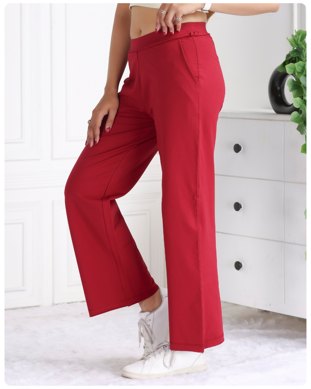 Dark rose all-day wide flare women pants & trousers by Mlada - Where style meets comforts! High-quality, trendy women all day wide flare pants also available in XXXXL size pants with free delivery and no cost COD & easy exchange. Elevate your wardrobe with these timeless, fancy bottoms. Crafted in-house with ethical practices, these curved pants embody our commitment to quality, comfort, and enduring style. Made in India with love.