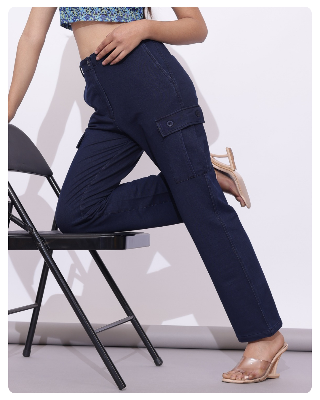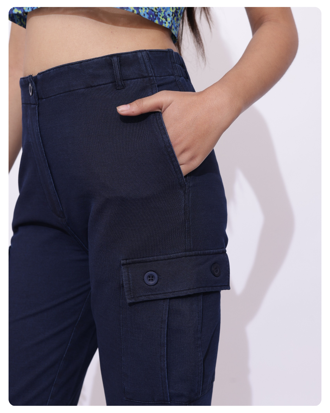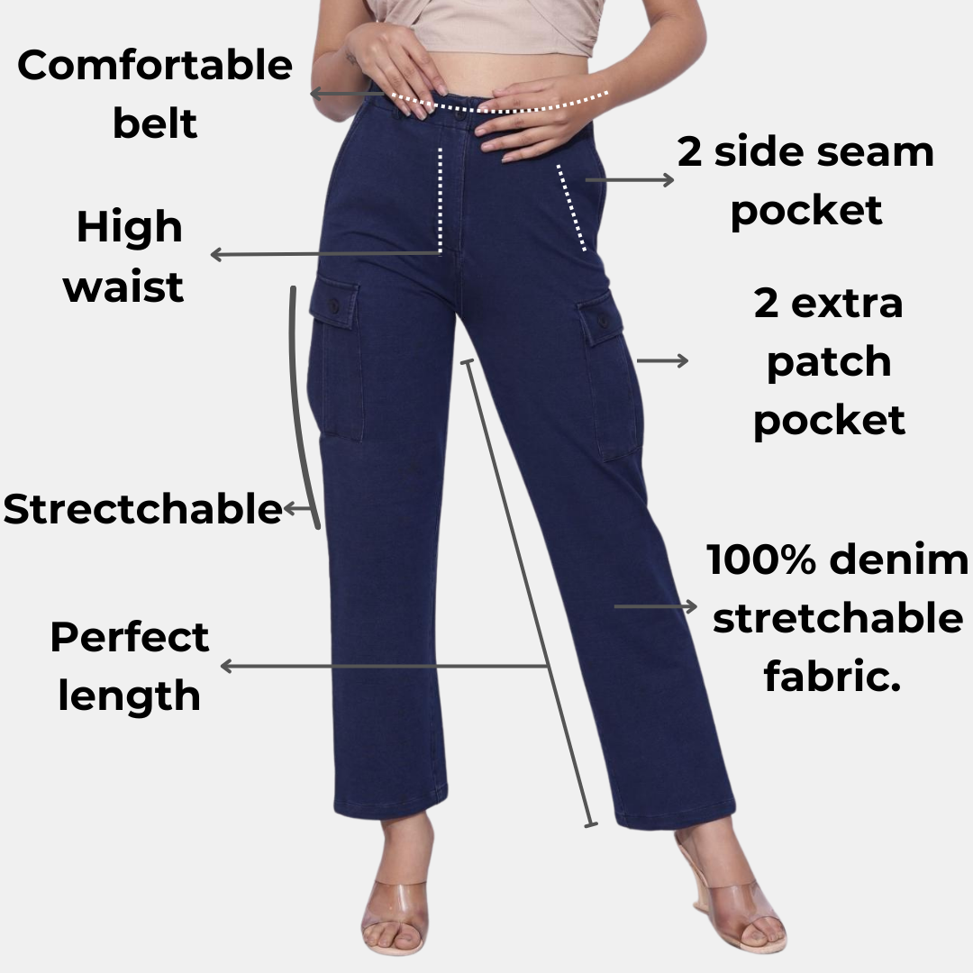 Navy blue denim cargo pants by Mlada - Where style meets comforts! High-quality, trendy, and available in all sizes with free delivery and no cost COD. Elevate your wardrobe with these timeless, fancy women denim cargos. Crafted in-house with ethical practices, these denim cargos embody our commitment to quality, comfort, and enduring style. Join us in redefining fashion with a purpose. We also have generic women pants and plus size women pants too.