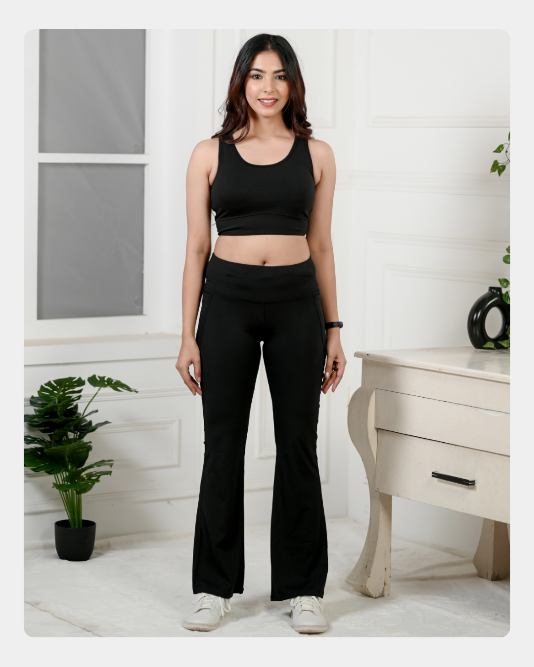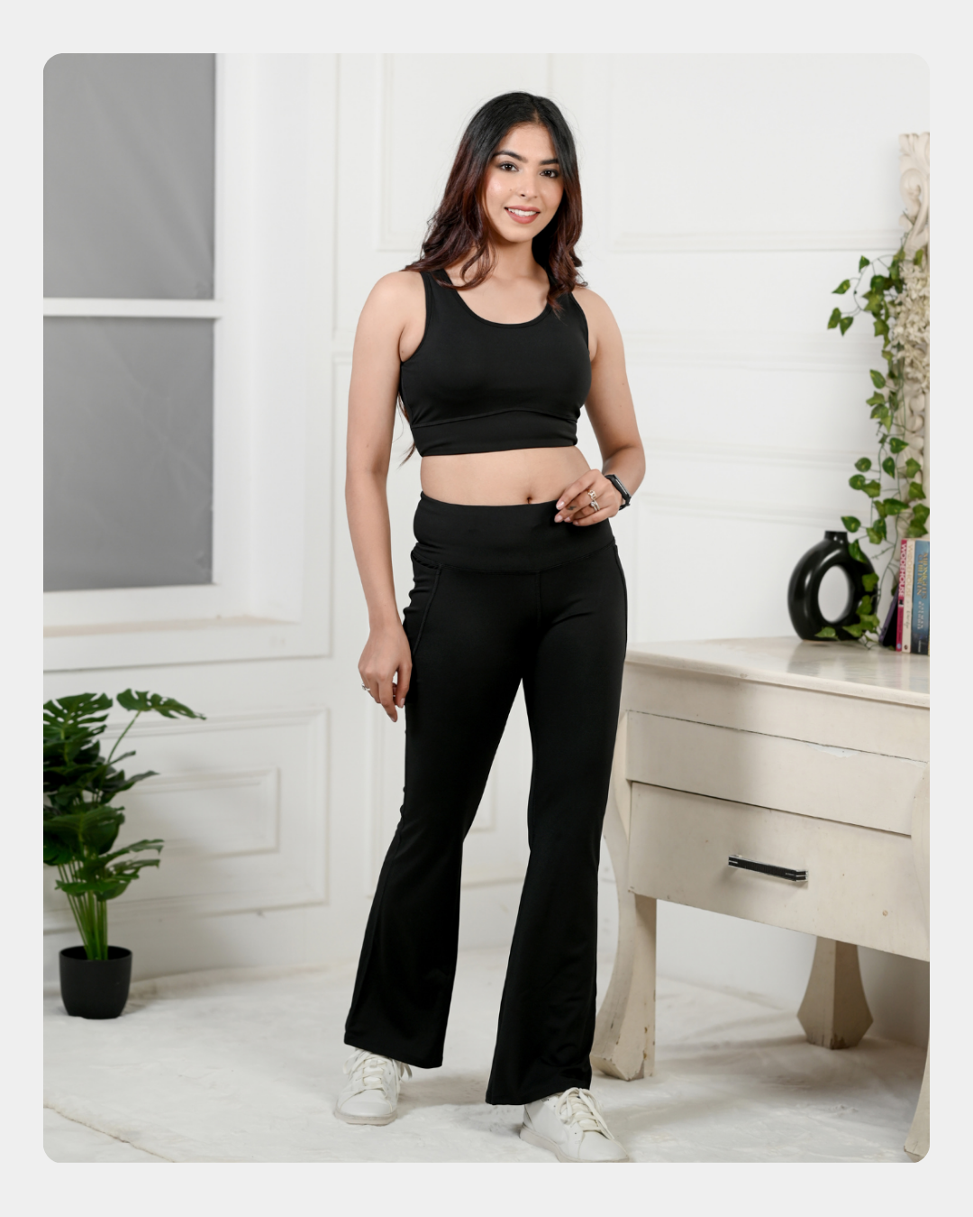 Crafted from the finest Poly - Lycra, our gym coordinate set with flare are a testament to uncompromising comfort.