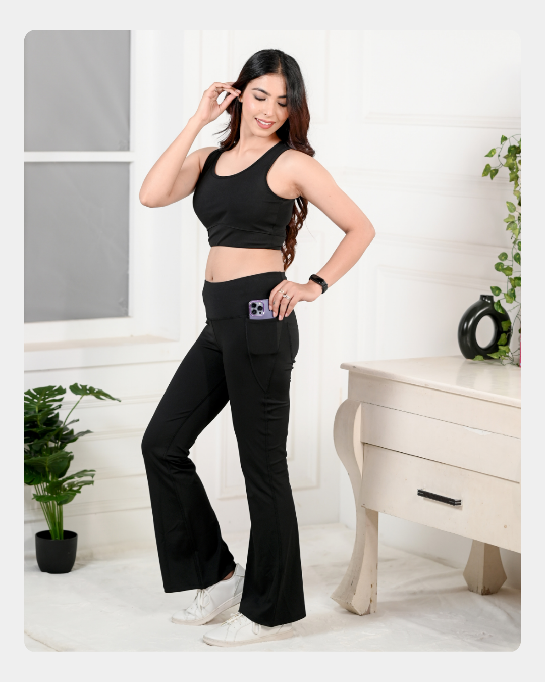 This black coordinate set is a must-have for any active wardrobe. It's sleek and versatile, and the quality is fantastic. Plus, the flare pants add a touch of fun!