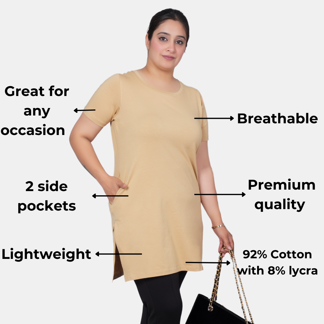 White long round neck cotton t-shirt with pockets - Long cotton t-shirt